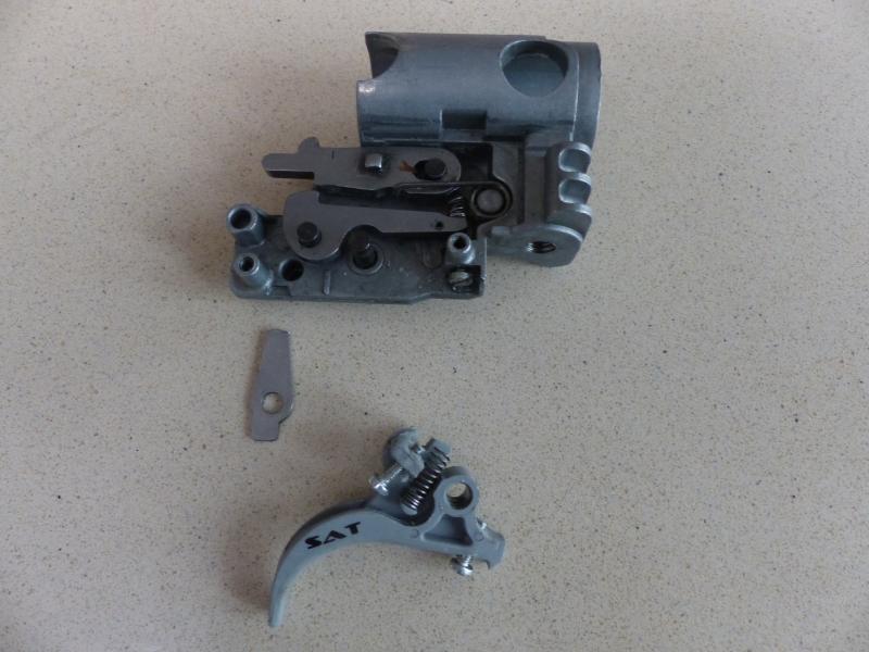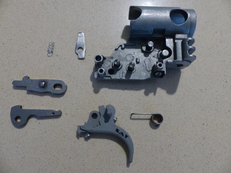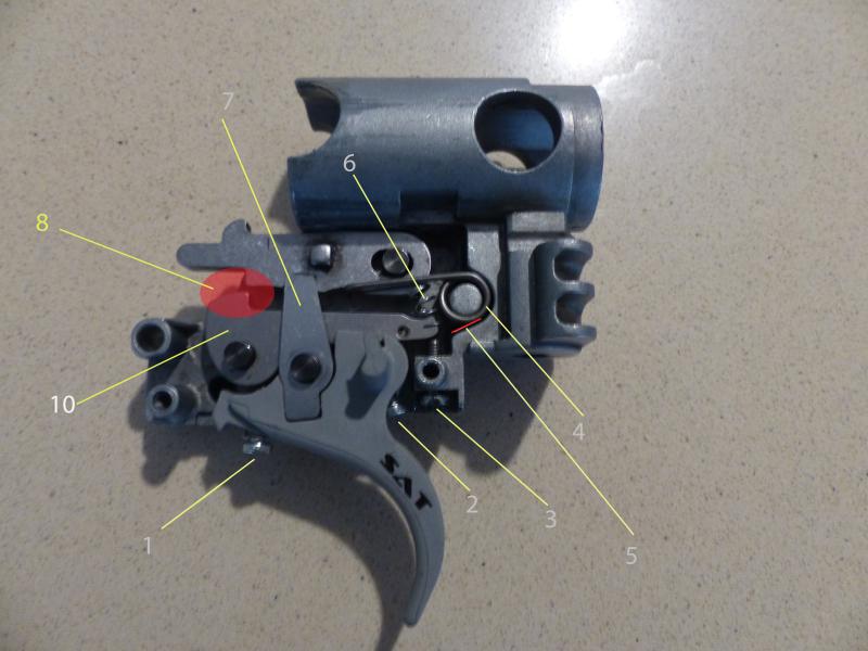 El problema del disparador es que el resorte nº4 al mismo tiempo que actúa sobre el disparador (la pieza de arriba que sujeta el pistón mientras está amartillada) lo hace sobre la pieza nº10 hacia abajo (esa pieza no ha de moverse accidentalmente prque provocaría el disparo) .. Lo que haces es desvincular ese resorte de esa pieza (la 10) cortándolo y poniendo un pequeño muelle (6) Así quitas peso porque ya no tienes que vencer la resistencia del resorte nº4 sino la del pequeño muelle solamente.