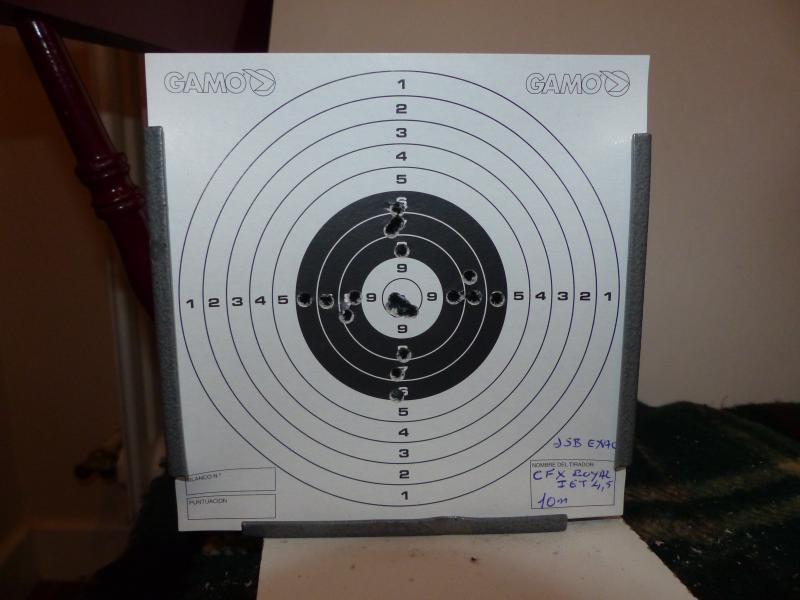 Sigo sin poder registrar la carabina por el tema del coronavirus y que no se puede hacer presencial de momento asi que estoy haciendo las gestiones por correo electrónico y parece que va lento el tema, así que solo puedo hacer pruebas en casa a 10m que es la máxima distancia que tengo para disparar, le coloque de momento de visor un leapers 6-24 - 50 y me apoye es una silla para hacer la prueba, ya se que no es el mejor apoyo pero es lo que tenia a mano, en la diana que subo y única que hice hay 10 disparos al centro y luego tire a borrar algunos números (en total creo que 22 disparos), también tuve que corregir algo el visor y ya lo deje bien centrado en el borrado de números en los horizontales , esos son los últimos disparos y como se ve se me fueron dos o tres disparos, (en algún momento se me agoto la paciencia de apuntar... )