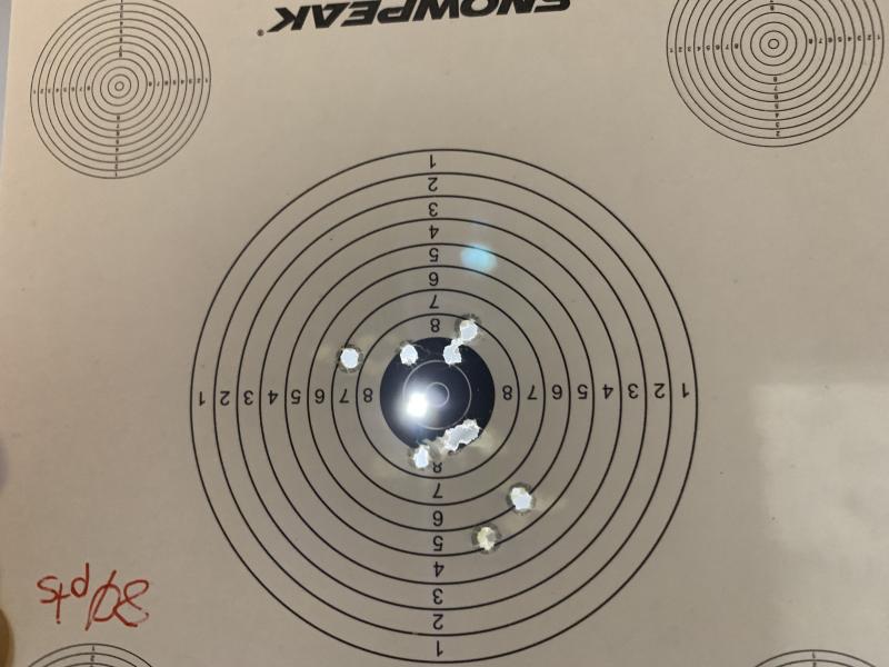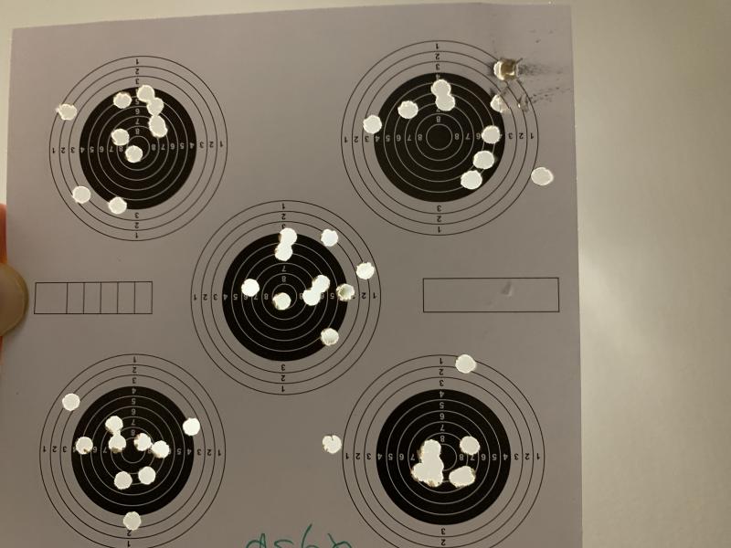 Ya que tienes esa pistola y estás disparando a 10 m. Deberías usar la diana oficial para la modalidad. Y no se si tendrás reguladas las miras para apuntar a pie de diana, que es como se debe apuntar.