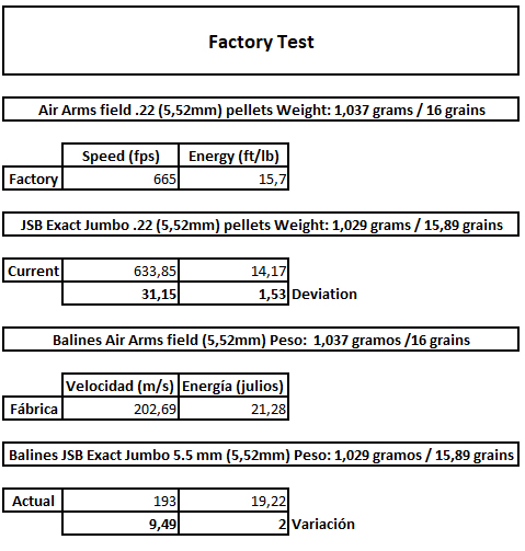 Solamente he disparado unos 240 balines desde que tengo la carabina. Como podéis ver en las imágenes en fábrica ellos obtuvieron una velocidad de 202,69 m/s y una energía de 21,28 julios con su balín Air Arms 16 grains y yo he obtenido con mi balín de 15,89 grains una velocidad de 193 m/s y una energía de 19,22 julios. La variación ha sido de 9,49 m/s y 2 julios de energía.