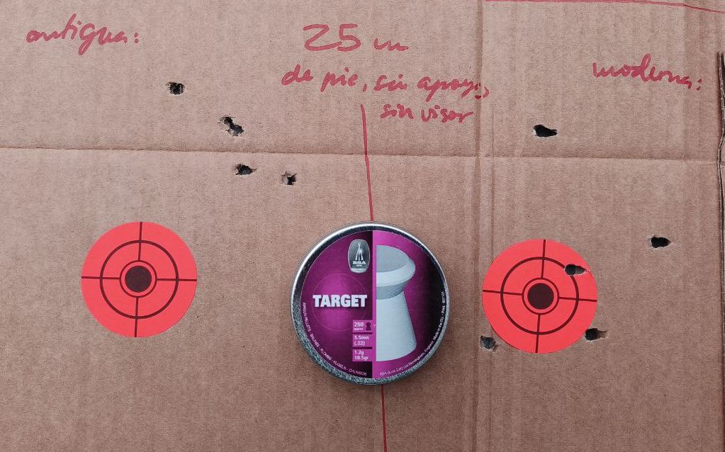 He seguido tirando este finde, una de ellas desde más cerca sin cambiar alza, a 25 m con los balines pesados BSA Target, estos le gustaron más a la Hunter veterana: