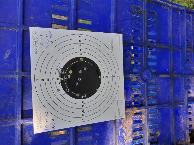 El apoyo,aunque cutre,al final es apoyo,aunque no ha sido sentado.Distancia de 30 m y los balines han sido Field T.Trophy,Excite Hammer y Gamo proHunter.