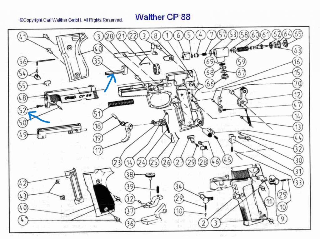 Salut, dos petit advertencias si la compras, la vis 52 en el despiece si no retienes la corredera al abrir, con el golpe le da por desenroscarse y estropear la pieza 35 qu'es en zamak (yo fabrique una en acero) el tornillo no es lo mismo para 88 que para la 88 competición