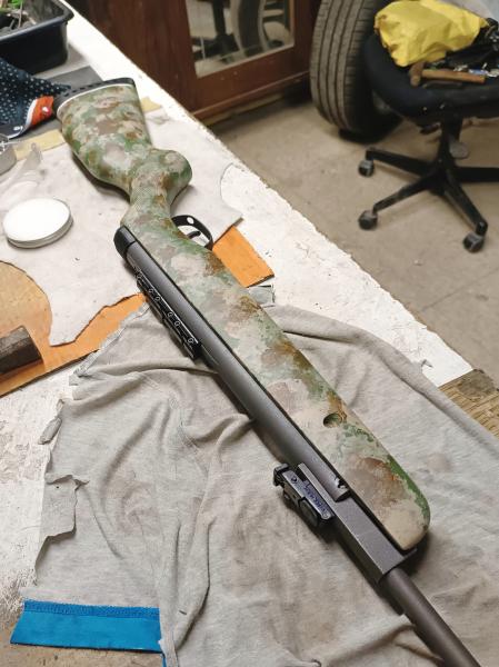 Opté por probar algo nuevo, y me atreví a profanar la culata de madera haciendo esta herejía de camuflaje casero. Para el acabado del metal, más de lo mismo. Pasé de pavonados en frío y nuevamente se me ocurrió que hacerle un cerakote sería una buena idea. El problema es que eso cuesta una pasta, así que pillé pintura de forja y, después de todo, y rematando con lana de acero muy suave, ha quedado un acabado bastante decente por poco más de 10 euros.