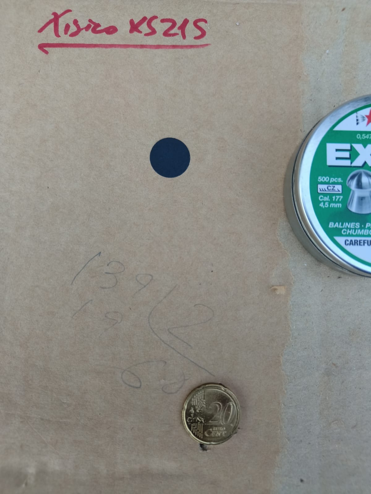 Creo que se confirma un poco lo que ya se había visto con miras abiertas, van aproximadas y la Gamo gana por poquito (la moneda tapa todo, en el otro caso asoma un impacto), he tirado apoyado en el primer caso como me recomendasteis, arma descansando "suelta" en el saco y con la mano izquierda girada sujetando donde la cantonera.