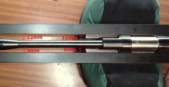 no puedes medir poniendo las reglas de referencia en la madera, en cada carabina te dara una medida diferente, esto es perfectamente normal ya que la madera no es un elemento de precision, si quieres ver como esta el cañon respecto a la carabina tienes que desmontar la culata y apoyar las reglas en la camara de potencia.