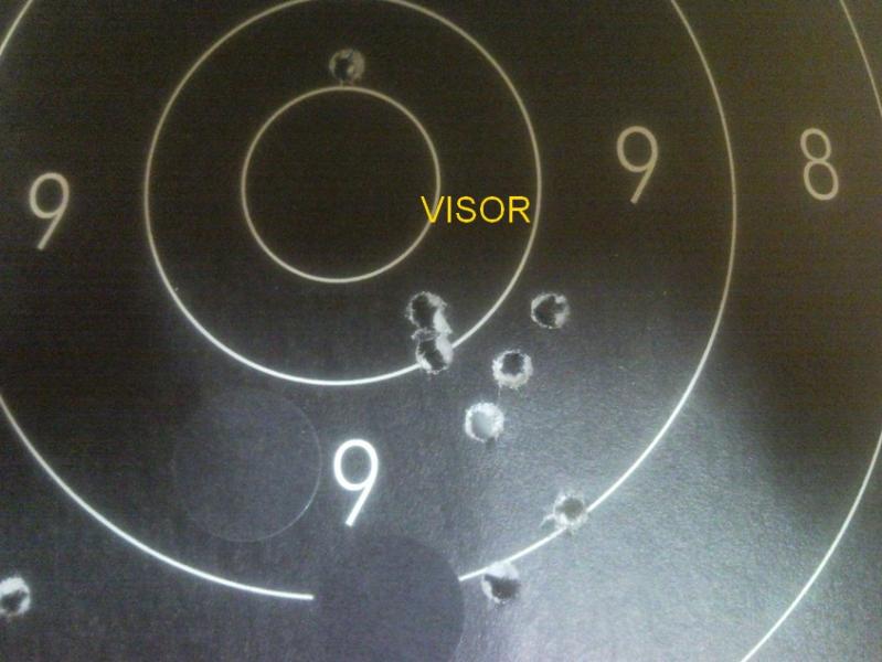 Asi que cansado de intentar centrarla, el brazo me dolia horrores, hice estos tres disparos apoyado, con miras abiertas a una distancia de unos 18m. No pude disparar mas porque oscurecia y no veia la diana.