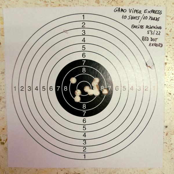 Bueno pues aquí mi primera diana con el nuevo chinoscopio de punto rojo que le he puesto a la Gamo Viper Express. Son diez disparos de pie y a pulso a casi diez metros utilizando balines Excite Plinking. El cañón de esta carabina es de ánima lisa, por lo que no ofrece gran precisión, pero para tiro rápido e intuitivo a corta distancia cumple bien. Saludos!!