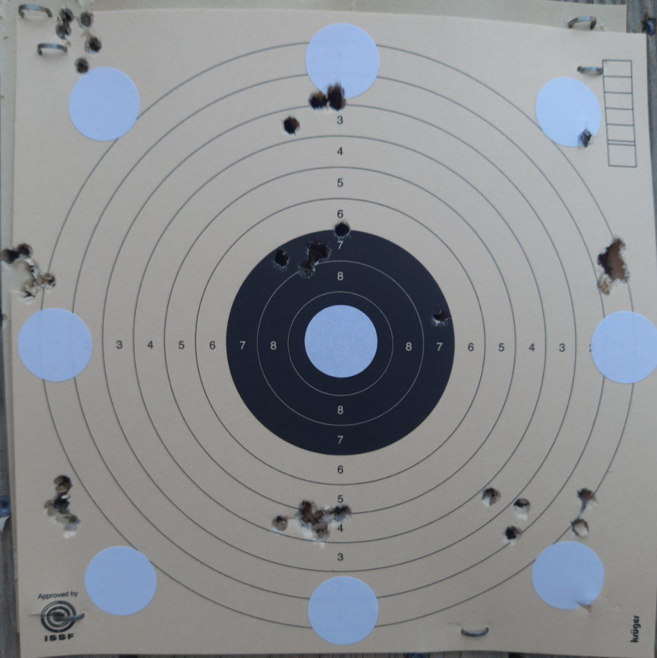 Hay un impacto en el 7 y en la parte superior derecha, son de los Gamo G-Buffalo. Para haceros una idea, apuntaba al punto blanco derecho de la parte central.