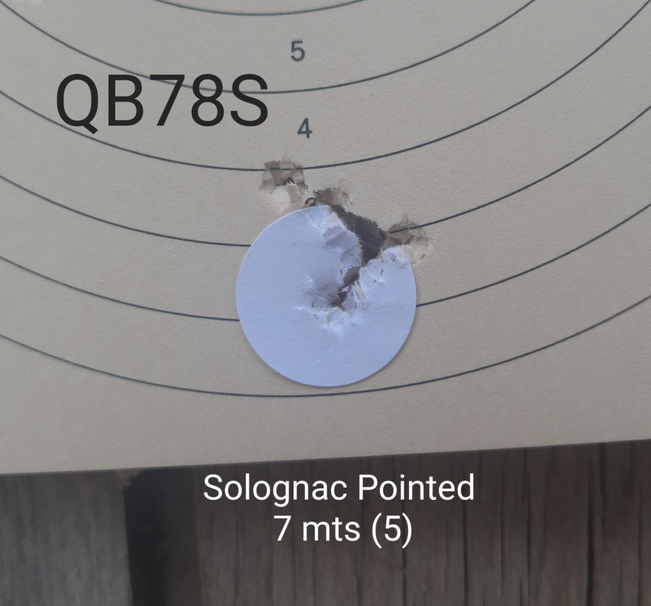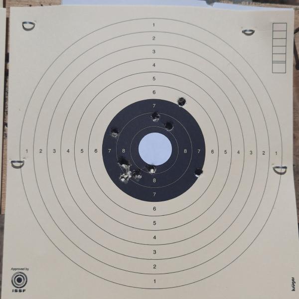 Como siempre, de pie a 7 metros, con miras abiertas y 5 tiros. El punto blanco son 2 centímetros.
