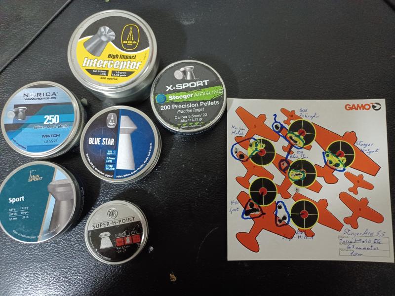 Para que tengáis una comparación con diferentes tipos de balines con la Stinger Ares 5,5mm a 10m.