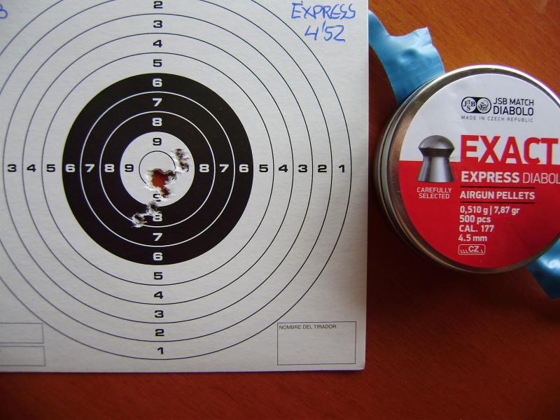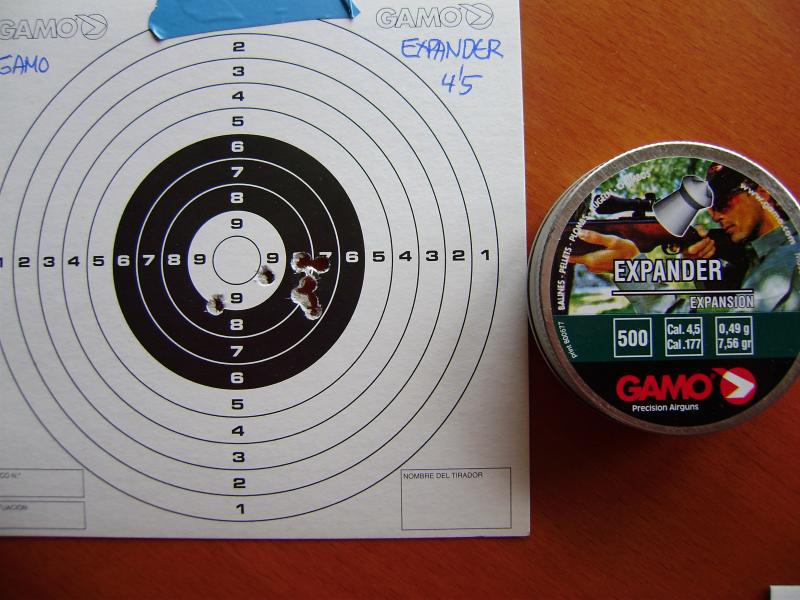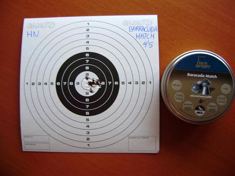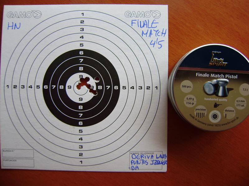 En fin, estoy disparando con algunos balines para probarla, entre otros los que me aconsejo "Chelin12" los JSB Express 4.52 que van muy bien, también con algunos modelos de Gamo como el ProMatch que ya tenía y con los HN Finale Match Pistol que los compré para mi pistola Alpha pero que curiosamente a esa distancia creo que no lo hacen nada mal.