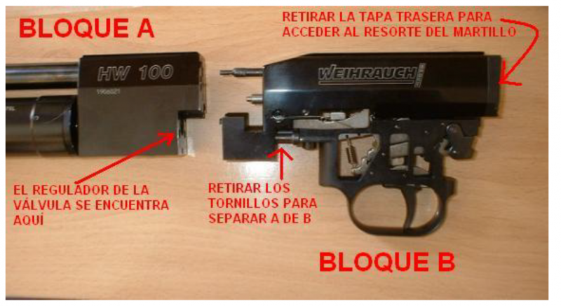 La diferencia de precio de una HW100, a otras carabinas mas económicas, básicamente esta en su ingeniería y diseño modular, no es todo metido dentro de un tubo, y poco mas, son tres módulos totalmente independientes, modulo del martillo, modulo del grupo disparador, y modulo de presión, que se pueden desmontar de forma independiente para cualquier mantenimiento o resolución de averías de una forma rápida, y muy simple.