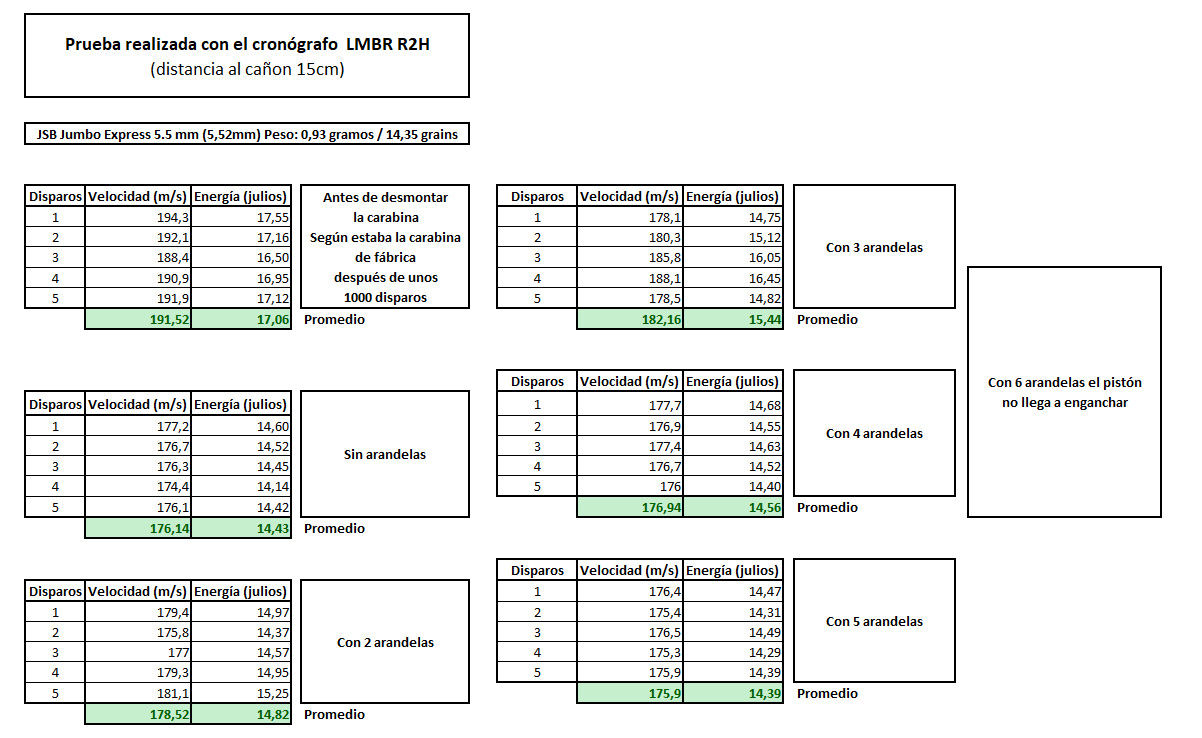 El caso es que al desmontar la carabina le cambié el sello del pistón y los dos sellos de la cámara de compresión, es decir las dos juntas tóricas. Estos sellos me venían en el kit de mantenimiento que compre FAC para esta carabina. Al volver a montar la carabina comprobé que la potencia cayó a unos 14 julios y por este motivo me puse a probar las arandelas para aumentar la potencia.