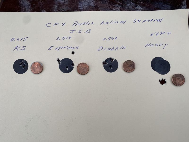 Subo otra mas de la CFX, siempre haciendo pruebas, esta ver probando balines JSB, a 30 metros, a destacar los dos extremos, el mas ligero y el mas pesado, especialmente este último.