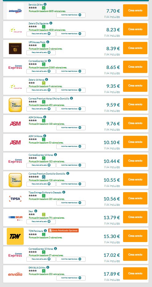 Te dejo una captura, de lo que cuesta enviar un paquete de una carabina, de unas dimensiones de 120X15X15 cm, y un peso de 7 Kg, que ya seria un paquete bien solido, desde A Coruña a Cadiz, en 24 horas (por cierto, el mas caro), cruzando España de cabo a rabo, y luego, me cuentas lo de los muchos euros y empresas premium, dado que hay mas presupuestos, pero entre ellos, ya están empresas como SEUR (13,79 €), UPS (8,39 €).........