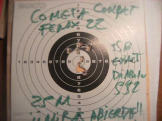 ESta es la agrupación que he conseguido con miras abiertas a 23,5 m mas o menos con balines jsb auténticos exact diabolo 5,52 , para mi muy buena ya que yo no soy bufalo bill jajaja, el apoyo con saquito como siempre. Por cierto 10 disparos.