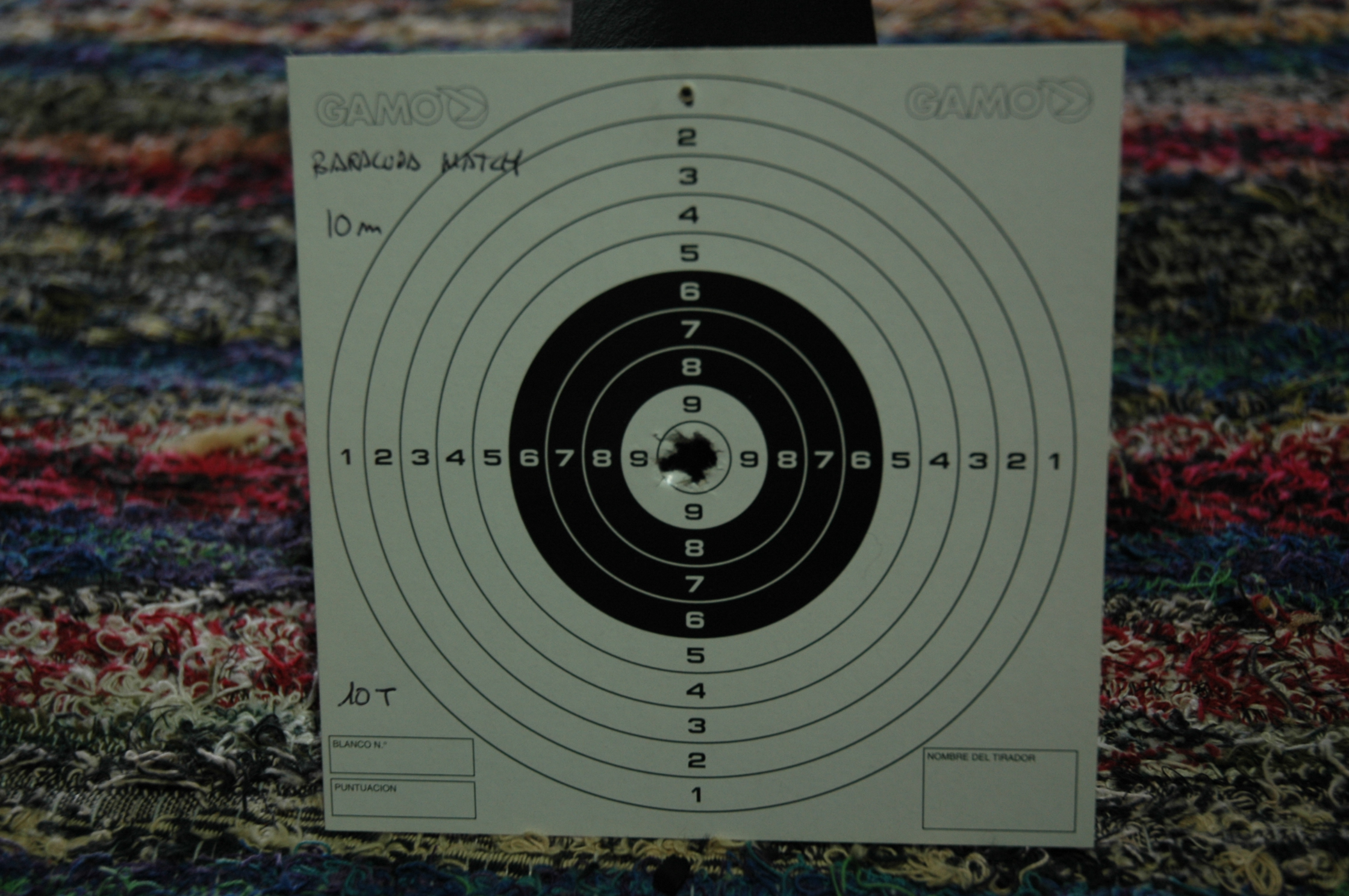 10 disparos con balín Diana High-Power a 10 metros. La circunferencia de la diana tiene un diámetro de 1cm, la agrupación ocupa 1/4cm...