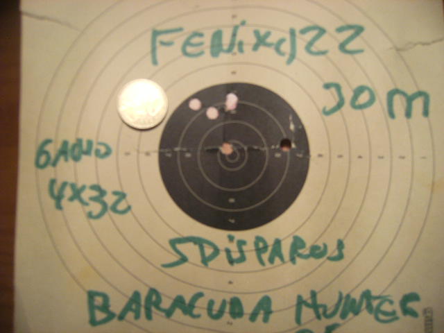Por fin¡¡ he aclarado el mistertio de mi fenix compact del 22 ,resusta que en garantia la mandé a la casa cometa , oasí me lo dijo Daniel de a,merino por lo visto al hechar fija tornillos en el pin de la montura pues se colo por el agujero de la bascula que va al disparador quedando este pegado ,bueno pues por lo visto el disparador es remplazado en Cometa, me llega la carabina y al probarla veo que está dura muy dura al quebrar el cañón y pega unos sopapos de miedo me recuerda a las hatsan,pongo una agrupación co ft.trophy y es discretita ,cuando hoy hablando con idelbarrio y pensando .,¿no la habrán puesto el muelle de 28j? pues si amigos y yo ya había traido baracuda hunter de segovia,esa es la explicación , de que no me agrupase como antes que hacia monoagujeros y esto me ha hecho con los baracuda a mas de 30m,el centro de esta diana no lo veia muy bien, pero estoy satisfecho a casi 30j¡¡