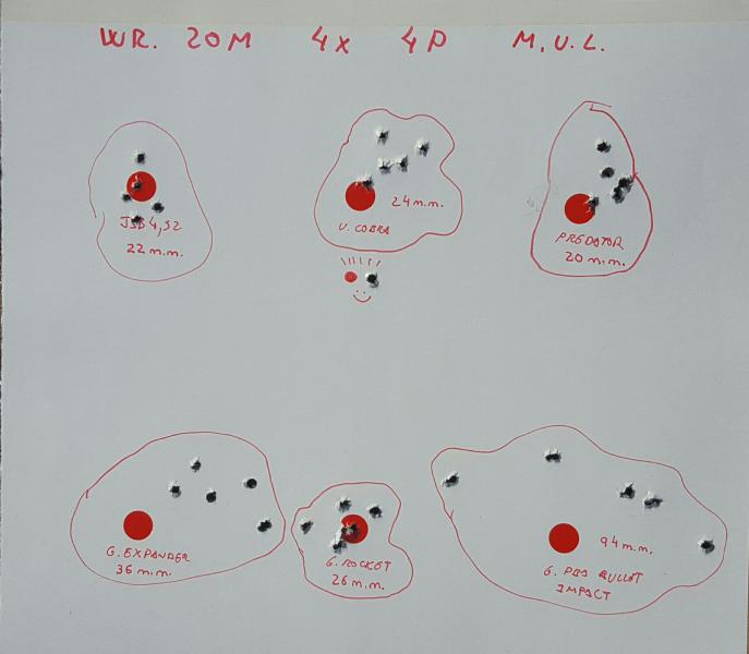Para 5 impactos he conseguido 20 mm con el predator y 22 mm con jsb. 24 mm con umarex cobra y 26 mm con gamo rocket. Sin comentarios las otras agrupaciones.