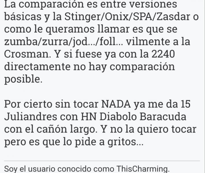 Mirad, tengo una crosman 2240 modificada y diseñada por mí. Yo mismo la monte a mi gusto, comprando las piezas en GMAC custom parts de UK. Cuando la tuve ensamblada, se la mande a la misma persona que me hecho la Stinger, y la QB78. El la volvio a desmontar, a pulir, tornear, agrandar y un sinfin de cosas, con lo que logro sacarle con balin de 5,5mm jsb exact de 16 grains, o 1 gramo, la insignificante potencia de 15,68 julios. El arma es letal, precisa como un bisturí, ademas de bonita y original, ya q se dice de las crosman que no hay dos exactamente iguales debido a la cantidad de accesorios y piezas que se fabrican tanto en Estados Unidos como en Inglaterra incluso en algún otro país con lo cual puedes lograr hacer un arma totalmente personalizada. No la voy a cambiar por nada ni se me ha planteado la idea de venderla porque comprando los acesorios pagando los portes a los desgraciados de los británicos y pagándole al chico que me hizo que funcionase cómo funciona esa obra maestra el arma supera con creces los 700 € ,