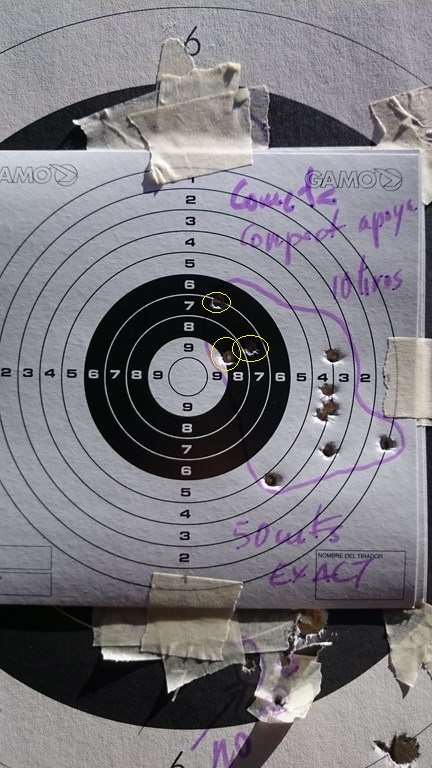 El próximo día lo intentaré a 50m y al aire libre, de mientras esto me ha servido de entreno y para saber que balines le van mejor, pienso que a esta GP le van mejor los Exact Jumbo ya que su peso mata un poco la potencia de 21j de la carabina y dispara mas suave además de llevar mejor trayectoria.