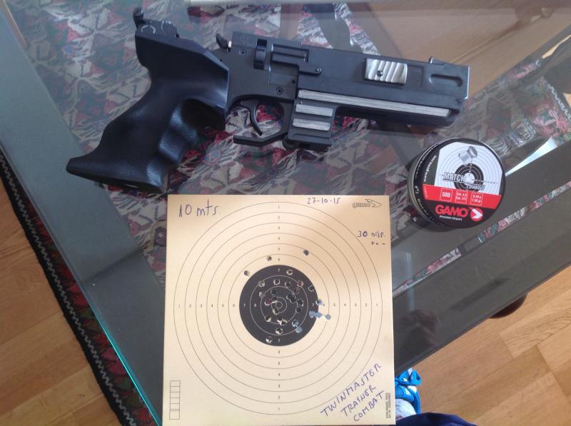 ahora al menos van entrando al negro casi todos aunque muy dispersos,alguien que tenga o haya tenido esta pistola,ha hecho algo serio en tema puntos,yo soy bastante malo, pero quiero saber si con este arma se pueden hacer buenas puntuaciones,yo de 420 no he pasado, pero me imagino que con práctica se puede llegar a 450 o más , ahí pongo una foto de la última tirada a 10 mts. en mi terraza y con un poco de viento.