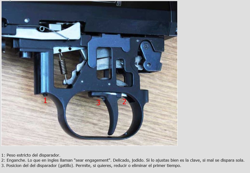 Tiene dos tornillos para regulación del recorrido y de dureza, como es habitual. A uno de ellos, el más posterior, se accede bien sin sacar la culata; pero al otro no. Está justamente bajo el gatillo, por lo que para acceder a él tienes que sacarlo ( o intentar desplazarlo a tope hacia un lado ,no se si daría ), actuar sobre ambos tornillos a ojo, volver a montar el gatillo, y probar qué tal ha quedado. Como no acertarás ni de broma a la primera, te tocará volver a repetir el rosario de desmontar gatillo, apretar uno ,apretar ( o aflojar, quién sabe ) el otro, volver a montar, y probar de nuevo.Porque el reglaje correcto es un sutil equilibrio entre esos dos tornillos, y te puede llevar horas de montar y desmontar gatillo hasta encontrar el punto justo. ¿ No sabías esto ?. Pues no sabes la suerte que has tenido de que"te haya gustado tanto" tal como vino de fábrica, macho. Pero no necesariamente será el caso de un comprador novatillo, que querrá precisamente éso,probar reglajes, subiendo y bajando recorridos y durezas.....a lo mejor para volver al mismo sitio de partida, ya que los alemanes saben muy bien lo que se hacen. Y que tú, veterano como eres, has reconocido como idóneo al primer tiro, pero que al principiante le va a suponer un amargo quebradero de cabeza.