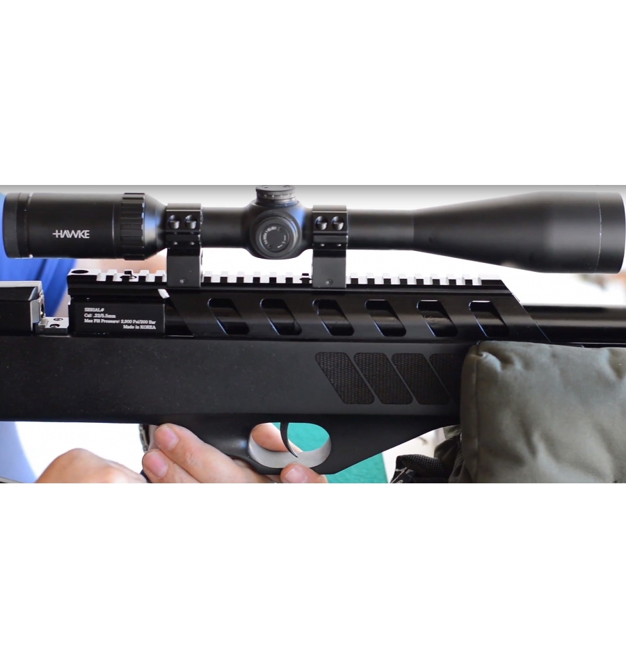 La mira telescópica de pocos aumentos que es lo suyo para un armas de aire comprimido, forma parte del conjunto sin molestar, aunque cuando pueda mi amigo que es el dueño pondrá miras normales abatibles, al ser el carril tan largo no hay problemas.