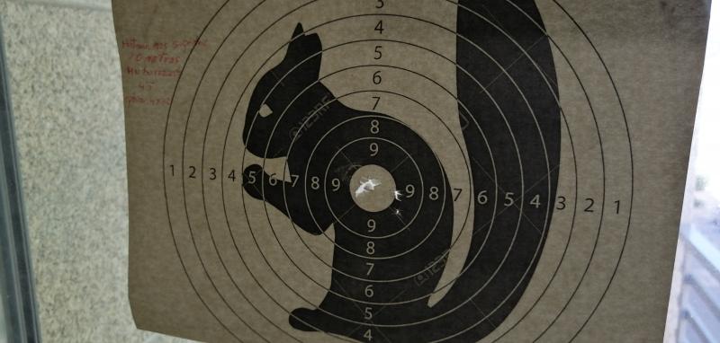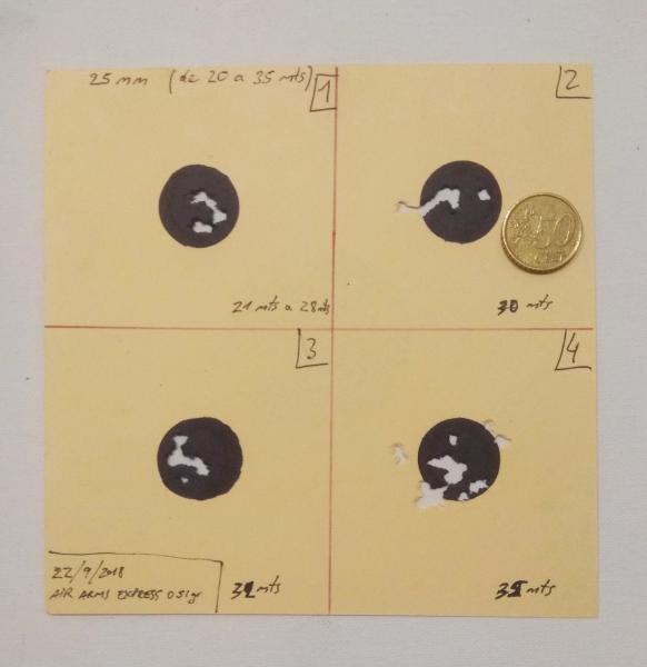 Como muestra dejo unas realizadas con mi hatsan M25 supertac vortex 4.5, a 10 metros en interior, Hn barracuda, posición de pie con apoyo y óptica 4x32.