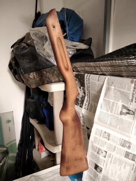 Para la culata lo que hice fue lijarla por completo, y aplicarle varias capas de tinte al agua color nogal hasta conseguir el tono oscuro que deseaba. Finalmente la acabé al aceite de teca, con unas cuantas manos, y para sacarle el brillo final, me pegué un buen rato frotando fuertemente con un trapo de algodón.