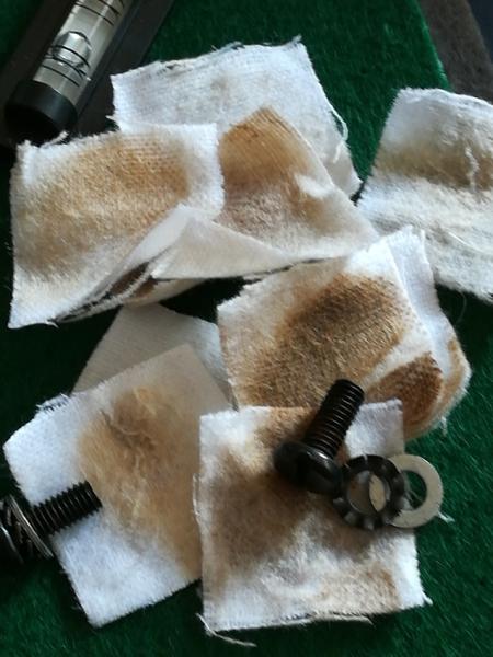 Pues bien, al desmontar la carabina y empezar a lubricarla, me llevo una desagradable sorpresa. Hay restos de óxido. La tornillería que sujeta la culata presenta sigonos evidentes de óxido. Y al pasar los paños con aceite por las zonas internas, salen bastantes restos. Como veis, no es solo "un poquito".