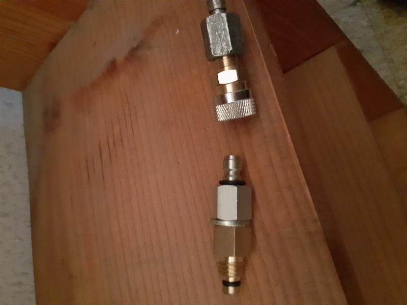 aquí tienes una foto de mi estación de carga, y una foto con el conector steyr pequeño unido a un conector standard, de esta manera puedo recargar desde cualquier estación de carga estándard, sin necesidad de andar enroscando y desenroscando el conector Steyr a la botella de aire.
