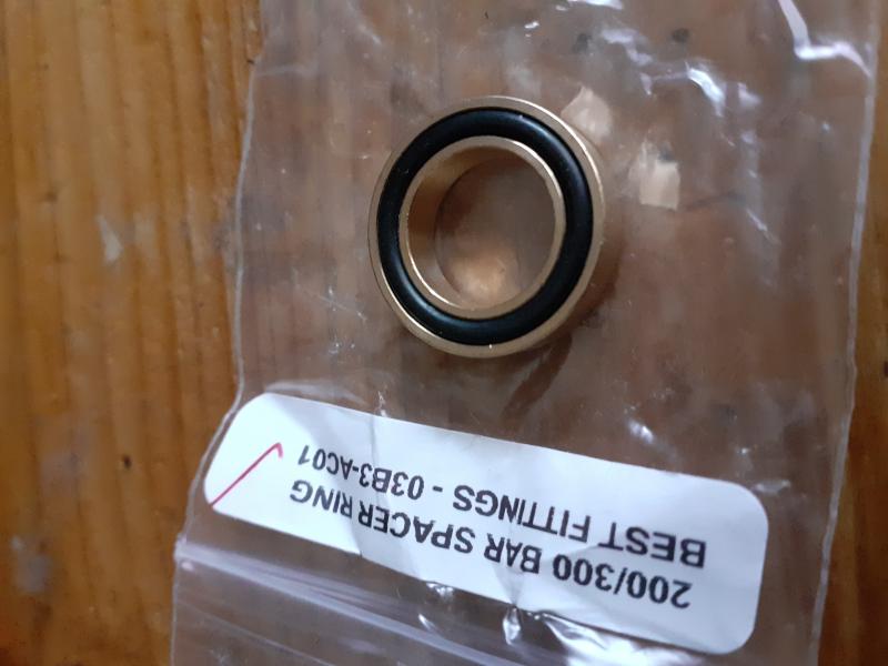ten en cuenta que una botella de 300 bares tiene una rosca más larga que la de las bombonas de 200 bares, y por tanto, si tu adaptador de carga es para botellas de 200 bares, deberás cambiarlo por uno apto para las botellas de 300 bares. o usar una arandela hermética complementaria que salve la diferencia de longitud de la rosca. algo como esto: