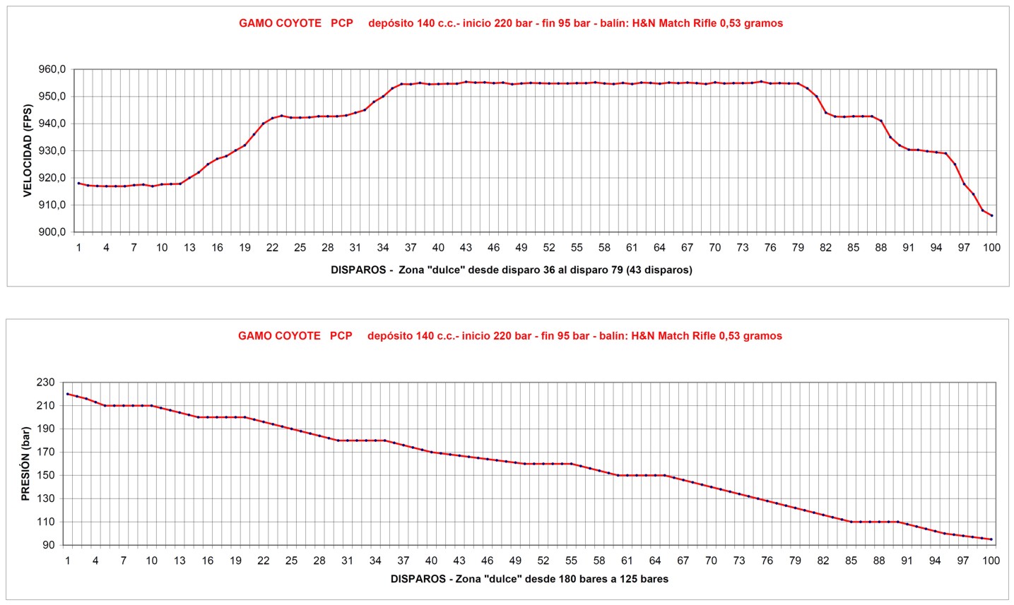 Te dejo la curva q saque de mi coyote. Creo q es fundamental conocerla para sacarle provecho y mas al no ser regulada. He tirado con pcps reguladas de muchos euros como hw100 o fx crown son reguladas y van fantasticas pero tienen depositos grandes inviables sin compresor o escuba a mi no me merece la pena todo ese gasto y lio de cacharros para poder tirar mas cargadores antes de recargar. Mis sesiones de tiro suelen ser de media hora o poco mas recargando con bomba dentro de la curva util apenas es esfuerzo el resto de la curva es tirar tiempo esfuerzo y desperdiciar balines. Pense en regularla con un huma pero viendo lo bien y estable q es en ese rango hw abandonado la idea. Si alguna vez lo hago sera solo x experimentar.