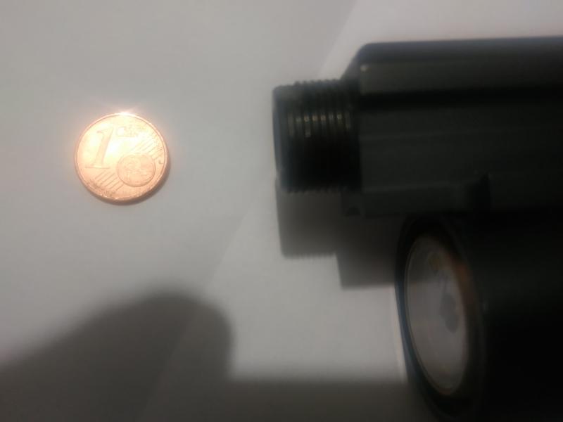 Hola buenas noches. Las fotos que adjunto son las del final del cañon de una pistola Artemis model PP700S-A. que viene con un moderador que rosca en ese trozo de rosca que se ve y al que le he puesto un céntimo de euro para dar idea de su tamaño.