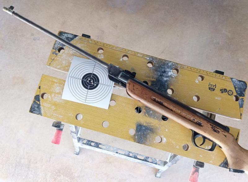 Va, me animo yo también... una Flecha 14 de los años 70, en calibre 5,5 y su diana con 10 disparos a 10 m, de pie: