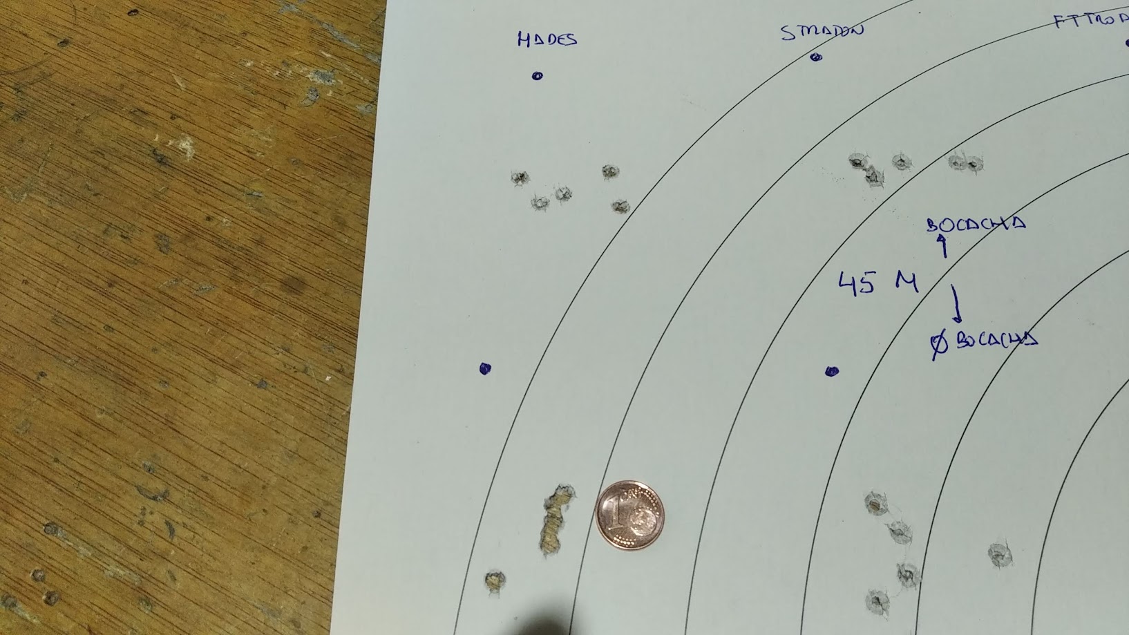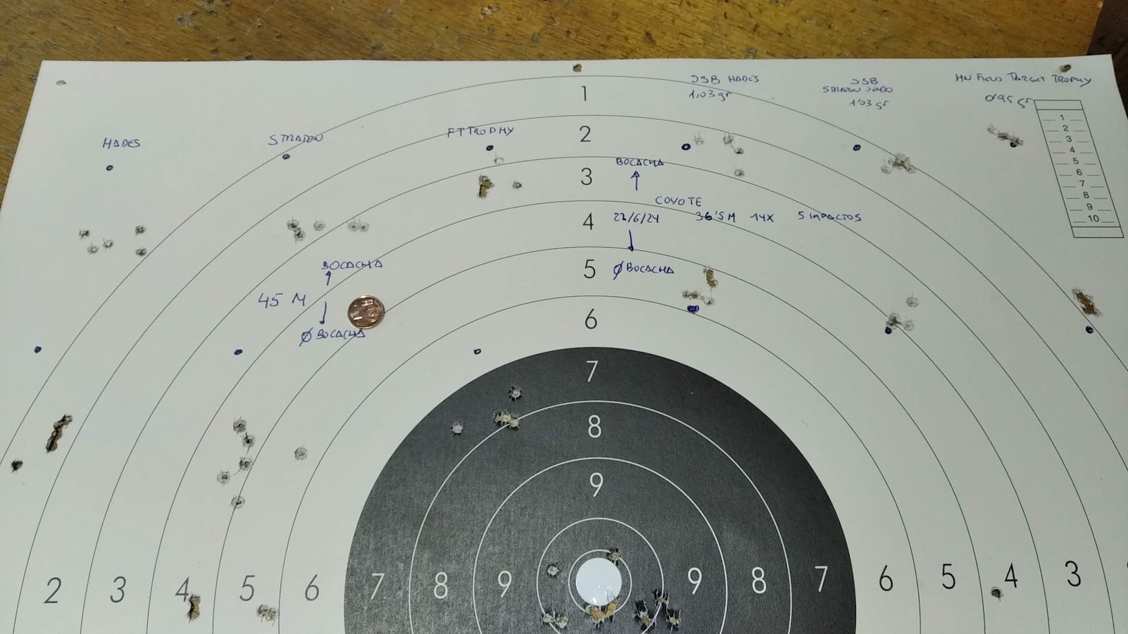 Aquí unas pruebas recientes a 45 metros de diferentes balines con la Gamo Coyote, con un tirador del montón, sin buscar precisamente un tiro pausado y sin seguir el catecismo del buen tirador, se puede sin duda mejorar, eso sí con una mínima puesta a punto del arma (sustituido el 8 de fábrica y fabricado un cargador monotiro en 3D, pero el gatillo tal cual sale de fábrica no se ha tocado)