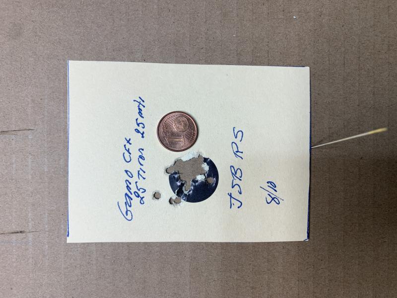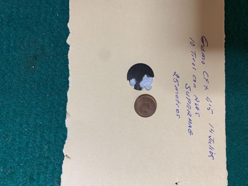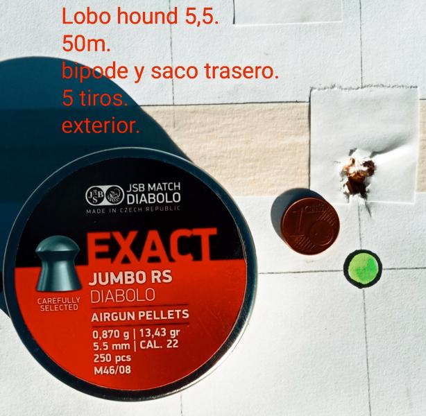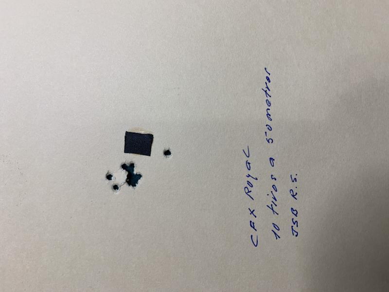 Aclarar que es mi primera tirada con slug, nunca había tirado antes con ojiva excepto unos 10 disparos que le hice unos pocos minutos antes a 41 metros con este mismo slug y otro de HN de 21 grains.