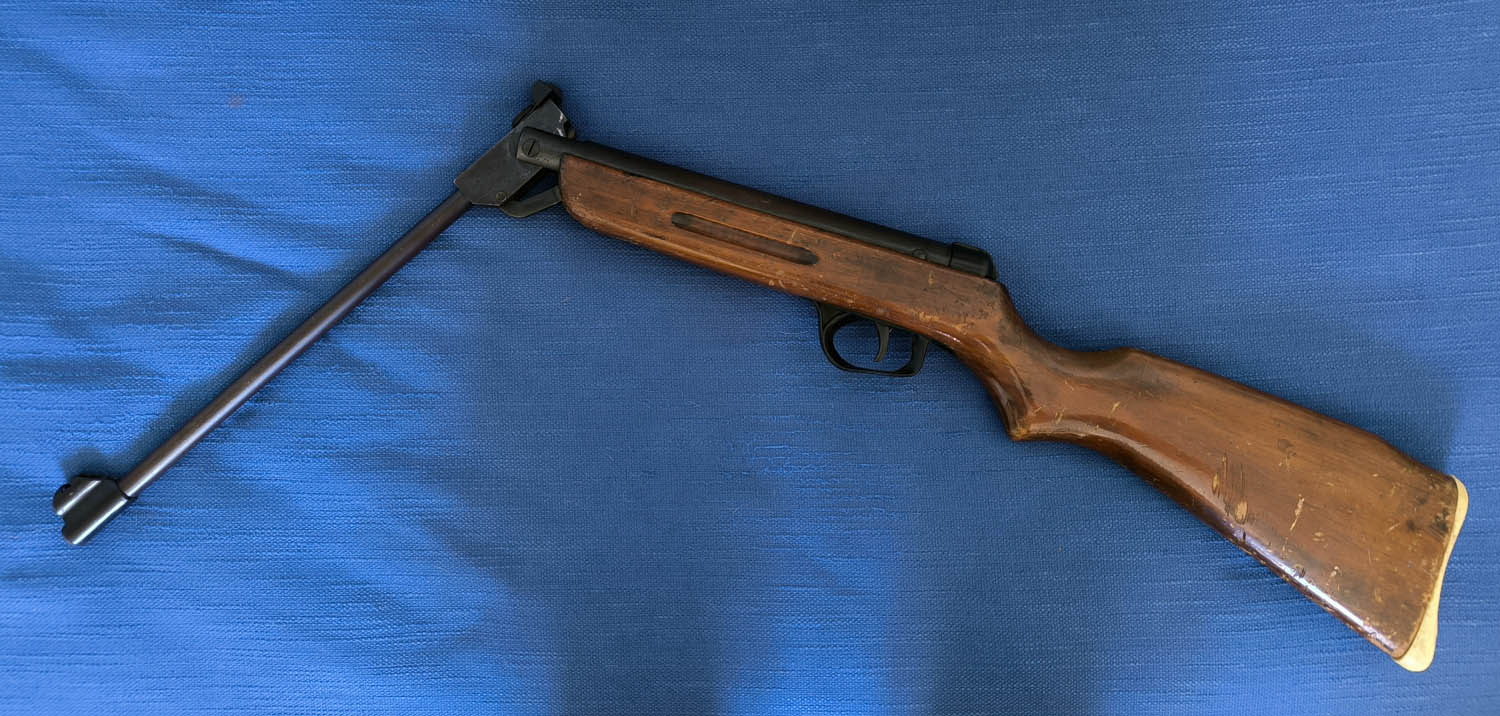 Descripción: Es un arma de resorte, cañón abatible o quebrado como se dice ahora y calibre 4.5 o .177 . Culata de haya y el resto metálico excepto cantonera, guardamonte, pieza del punto de mira y ruedas de regulación del alza, o sea, el esquema de fabricación tradicional de aquellos tiempos