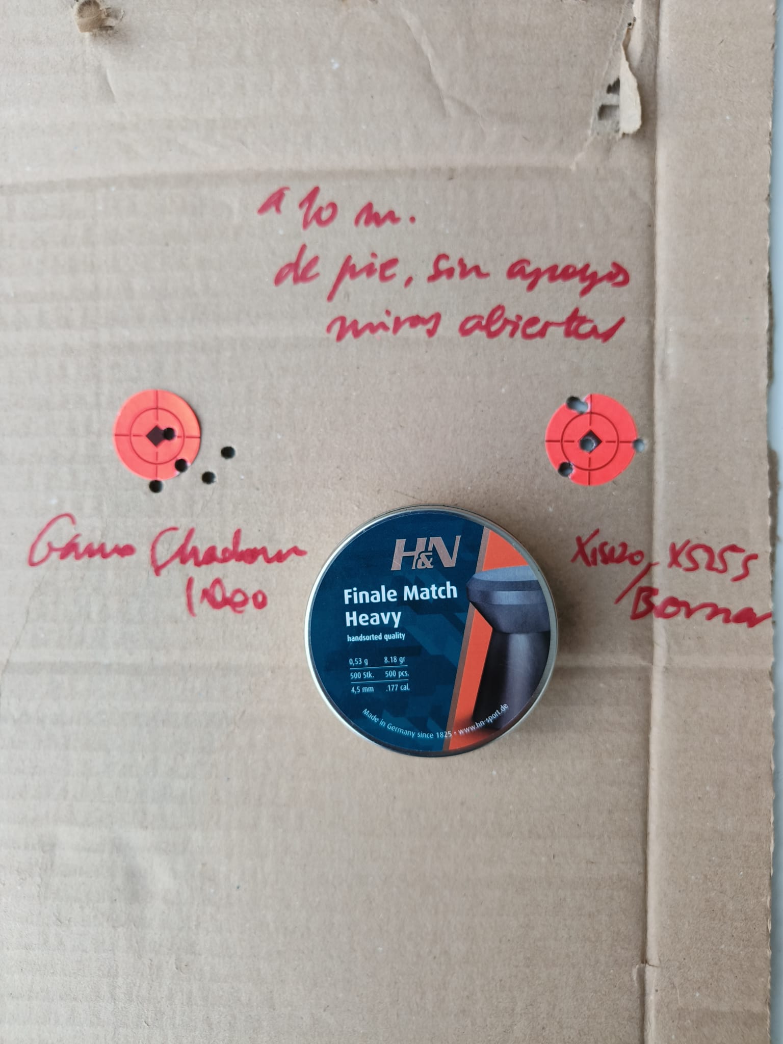 Y acto seguido probé a la misma distancia, 10 metros, pero esta vez de pie y a pulso, con balines H&N