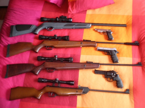 esa pequeña es una norica 56 que fue mi primera carabina me la regalo mi padre cuando tenia 14 años, tiene 11 años, y jamas la e tocado y va de cine, y la mira esa era de un rifle del 22 de mi padre, el tiro va un pelin bajo pero bien, las demas de abajo a arriba son norica marvid good 4,5 la norica storn 5,5 y la viper spres de gamo, los visore 4x32 gamo y el visor de la spres el vampir ese de gamo revolver r77 gamo y la otra la gamo v3 la de arriba es una detonadora perdon por las faltas que en eso no soy muy bueno bueno se entiende, jeje chao un saludo.