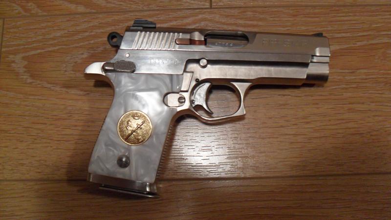 Dispongo de una Firestar M43 en brillo y estoy apunto de cromar el cañon y guia del cañon con nitruro de titanio, corredera y armazon de nitruro de Cromo mate, estos materiales estan garantizados y actualmente es lo mejor que hay en el mercado, incluso mejor que los baños electroliticos en oro,para dejar un acabado perfecto y uniforme como las Sig Sauer,las cachas son imitación nacar con un fresado redondo, donde se ubica un medallón español de militaria bañado en oro.