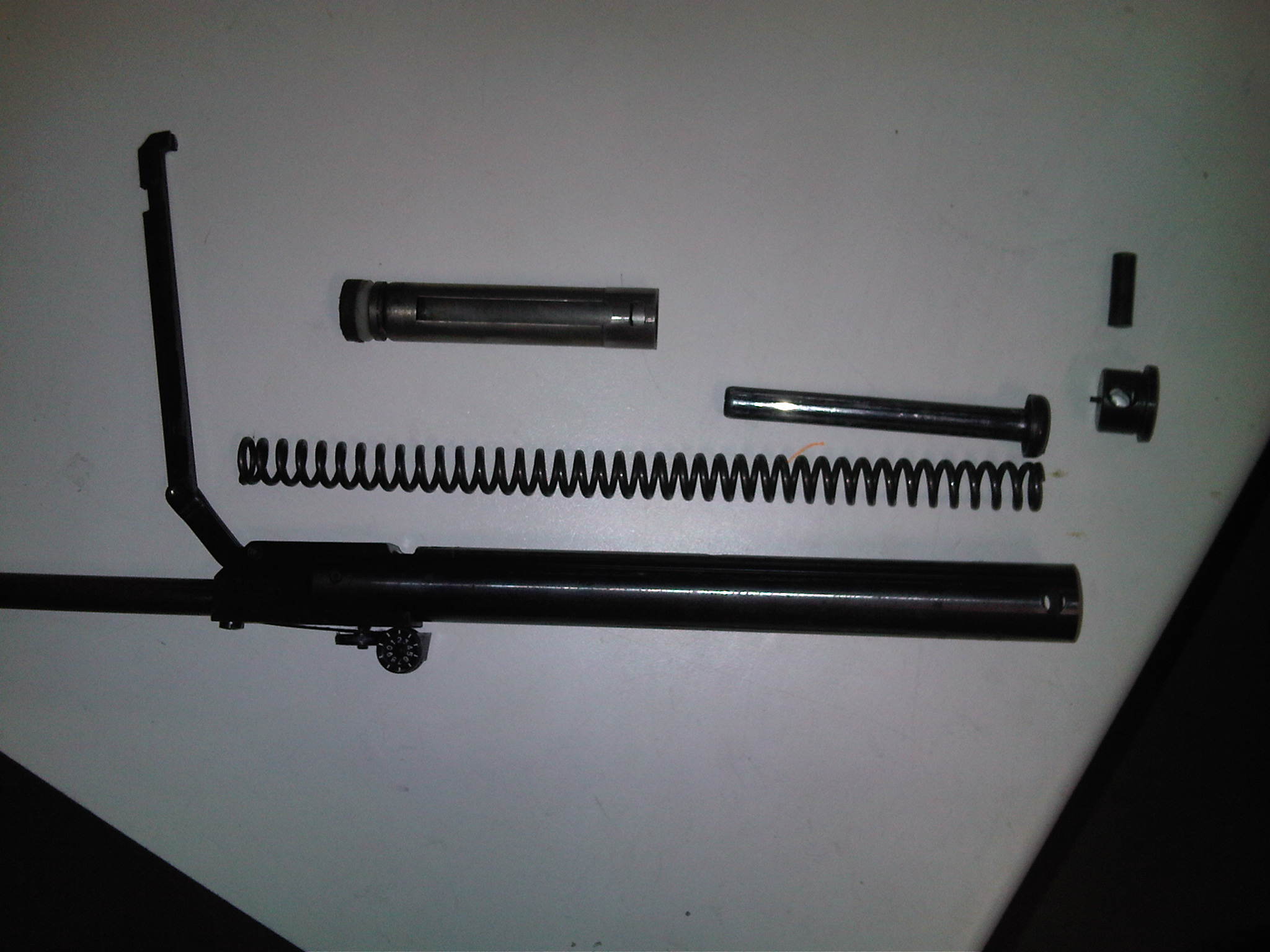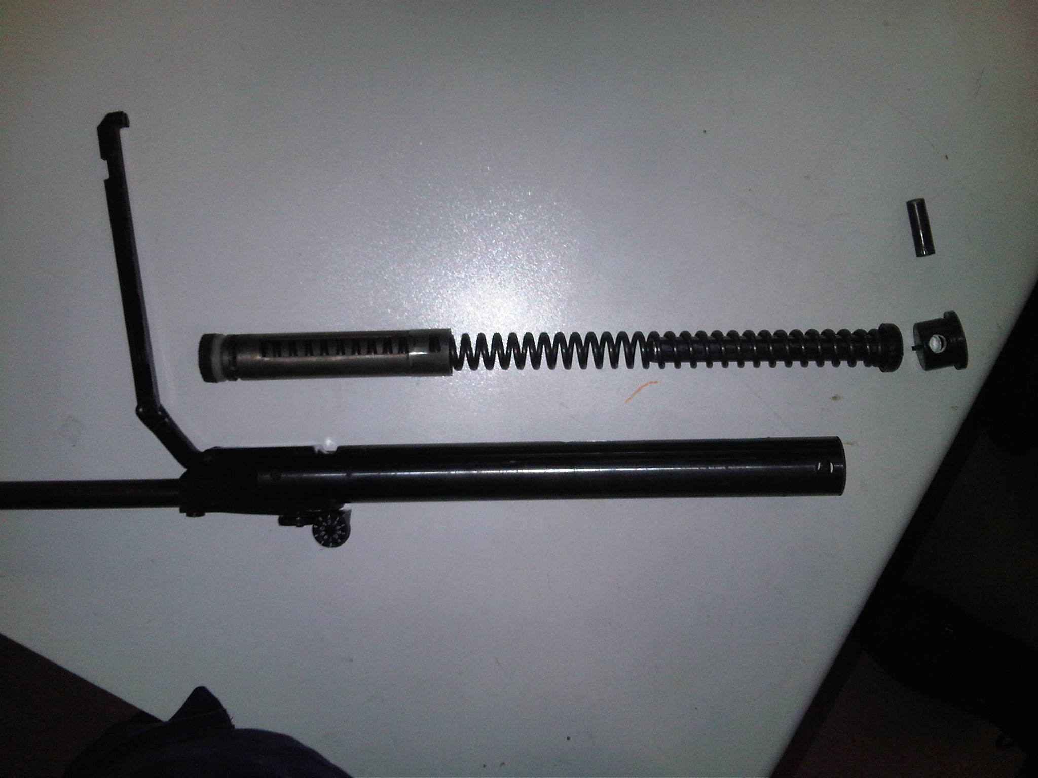 Quitale la mira el alza el cargador y los soportes y todo aquello que se pueda romper por acidente en el proceso cambiar el muelle.
