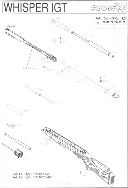 He desmontado mi gamo Whisper IGT para limpiarla, se ha caido una pequeña pieza de plastico, en el plano es la marcada con el numero de referencia 16080. No se donde C........s va. El caso es que sin ella, al quebrar la carabina, la biela toca la carcasa de plastico y es imposible montarla.