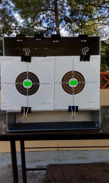 Compañero, yo tengo una similar, la he hecho con una caja de vinos, al fondo una chapa de acero galvanizado, y para evitar rebotes porexpan extrusionado, el balín pega en la chapa y queda atrapado en el rebote en el porexpan, después he dibujado las dimensiones del folio en el chapón que cierra la caj, he colocado 4 arandelas, una en cada esquina y sujeto las dianas con imanes, va de lujo. A ver si pongo fotos.