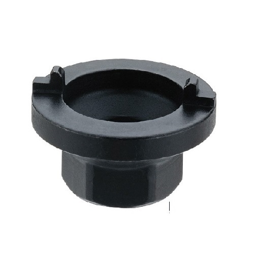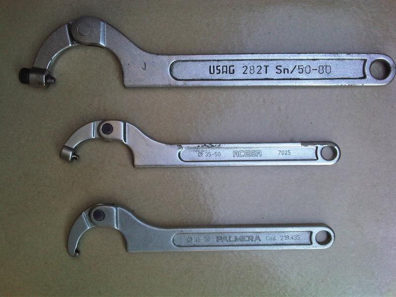 Es parecida a una llave de tubo con dos cuernecitos que son los que encajan en las muecas de la tuerca interna.
