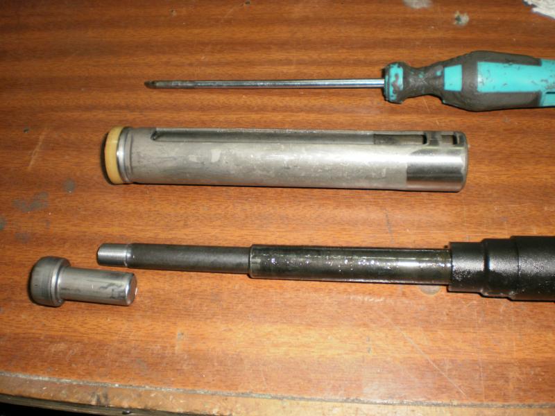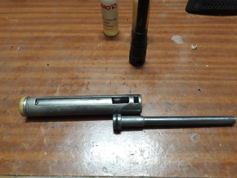 Para ser mas exactos,esta guía no entra justa justa dentro de la otra,tiene algo de juego.Lo primero que he notado ha sido que efectivamente hay algo que roza,NORMAL,es la guía deslizándose por dentro de la otra,es un poquitín pero se aprecia.A lo mejor si la hubiera hecho mas justa,hubiera sido peor a la hora de armar...porque pienso que el propio MECANISMO de origen no está diseñado ni preparado para llevar a montar el pistón RECTO hacia atrás,lo pienso así porque el propio pistón tiene unas décimas menos que la cámara y la palanca de carga lo ajusta hacia mas bien abajo.
