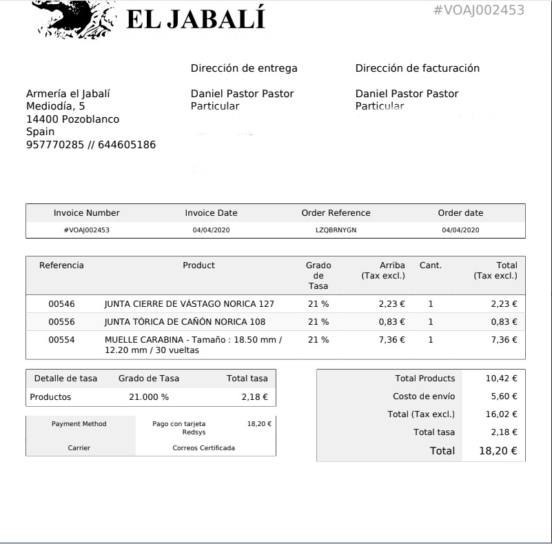 Adjunto factura con la referencia y medidas del muelle, así como la página de la armeria con los diferentes modelos que tienen. He señalado en rojo el que hay ahora sustituyendo al que pedí.