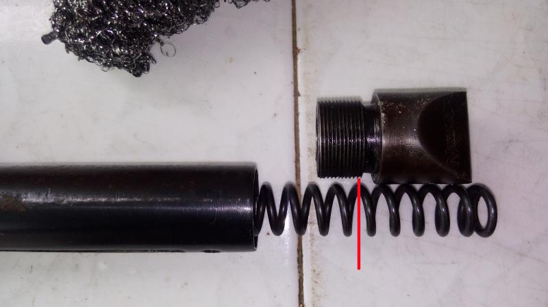 No me importa si me da 5 julios en vez de 7. No voy a disparar con ella a precisión (es de ánima lisa), pero si quiero dejarla funcional y como recuerdo para mis hijos de su abuelo al que no conocieron, y si se presta, sacarla algún dia a que le de el aire y agujerear unas latas. Paso nueva foto con el muelle en el pistón y haciendo tope en la pared de la cámara, con lo que sobresale y marcado por donde yo cortaria, a menos que esté equivocado. Al no tener mucha experiencia en este tema, seguiré vuestros consejos para no haber molestado en vano.